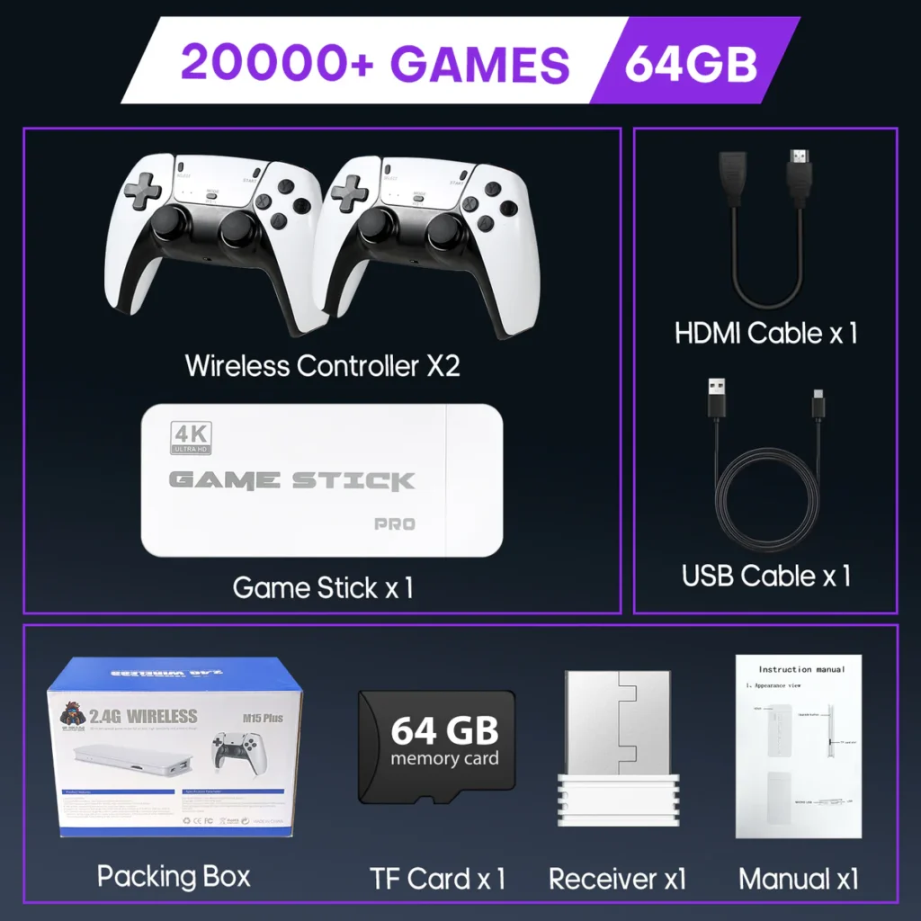 Relive the 80s & 90s with the 4K Retro Game Stick – a plug & play console with 20,000+ preloaded games, 4K HDMI output, and dual wireless controllers. No Wi-Fi, no downloads. Just plug into your TV and play instantly. Perfect for family game nights, gifts, or nostalgic solo sessions. Ships fast worldwide.